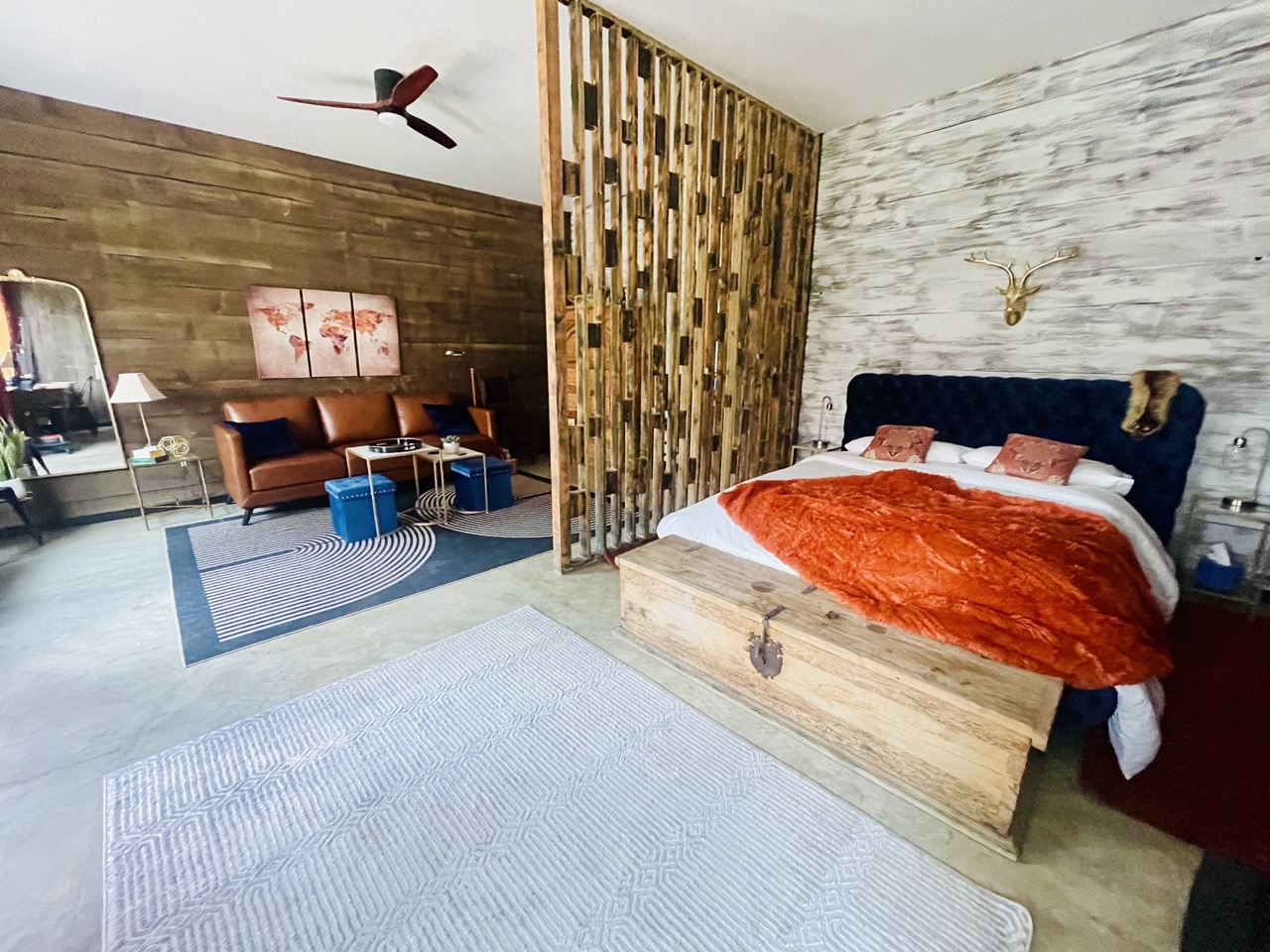 This beautifully renovated lower guest unit of the main house offers a cozy and private retreat. The owners reside in the upstairs unit. This guest unit features a master room with a bedroom sectioned off by a custom-built floor-to-ceiling room divider, a formal dining room, a living room with a TV, a desk, a kitchenette, and a bathroom with a rainfall showerhead and handheld sprayer. The oven-less kitchenette includes electric burners, a sink, a refrigerator, an electric kettle, a rice cooker, a microwave, a toaster, and a Keurig. Outside, you'll find a picnic table with benches and two loungers, perfect for relaxing and taking in the beautiful forest views.